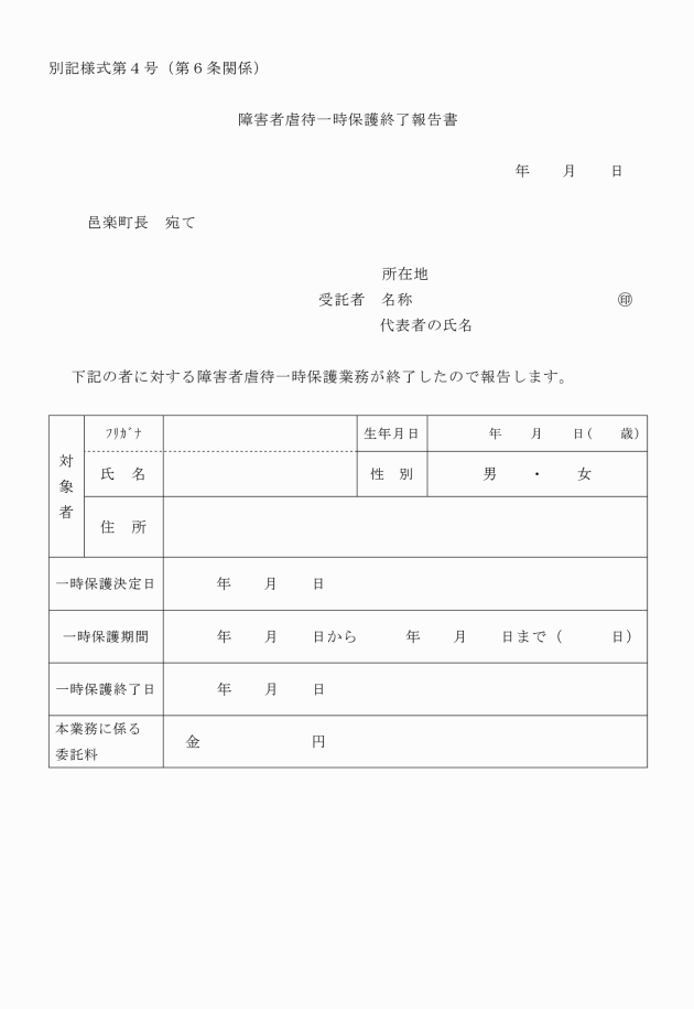 第4条 事業の対象者(以下「要援護者」という。)は、邑楽町内に居住する障害者のうち、養護者による虐待を受け、生命又は身体に重大な危険が生じるおそれがある者で、町長が事業の利用について必要を認めたものとする。