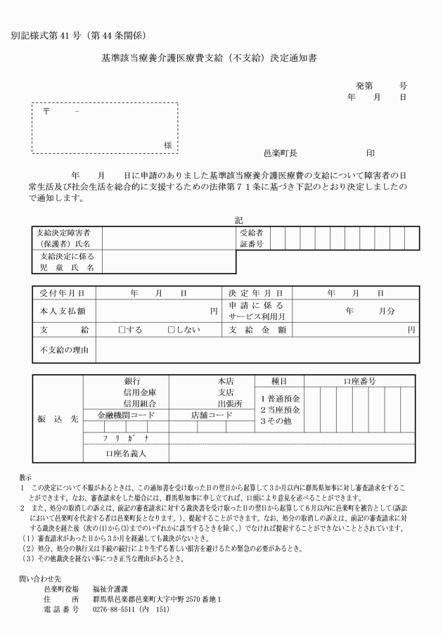 3 町長は、省令第65条の7第1項の規定による申請に対し、補装具費の支給を行わないことを決定したときは、補装具費(購入・修理)支給申請却下通知書(別記様式第45号)により当該申請を行った者に通知するものとする。