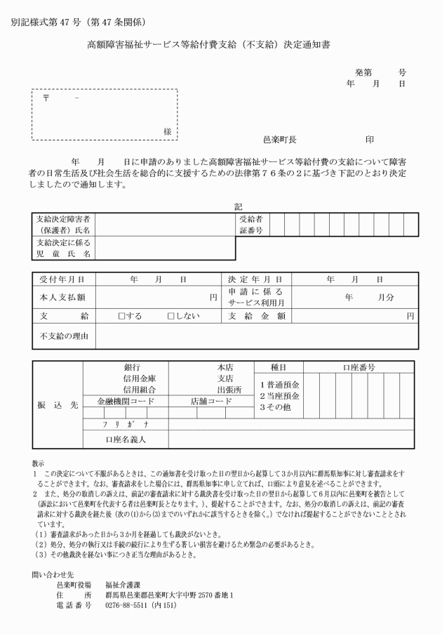 2 町長は、省令第65条の9の2第1項の規定による申請があったときは、高額障害福祉サービス等給付費の支給の要否を決定し、高額障害福祉サービス等給付費支給(不支給)決定通知書(別記様式第47号)により当該申請を行った者に通知するものとする。