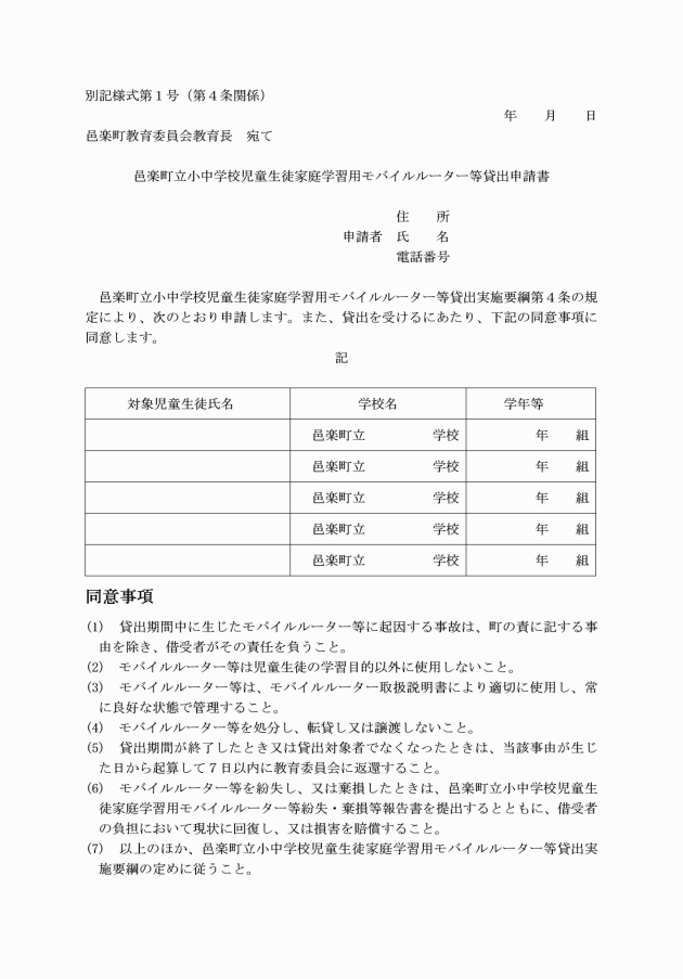第4条 モバイルルーター等を借り受けようとする者(以下「申請者」という。)は、邑楽町立小中学校児童生徒家庭学習用モバイルルーター等貸出申請書(別記様式第1号)を邑楽町教育委員会教育長(以下「教育長」という。)に提出しなければならない。