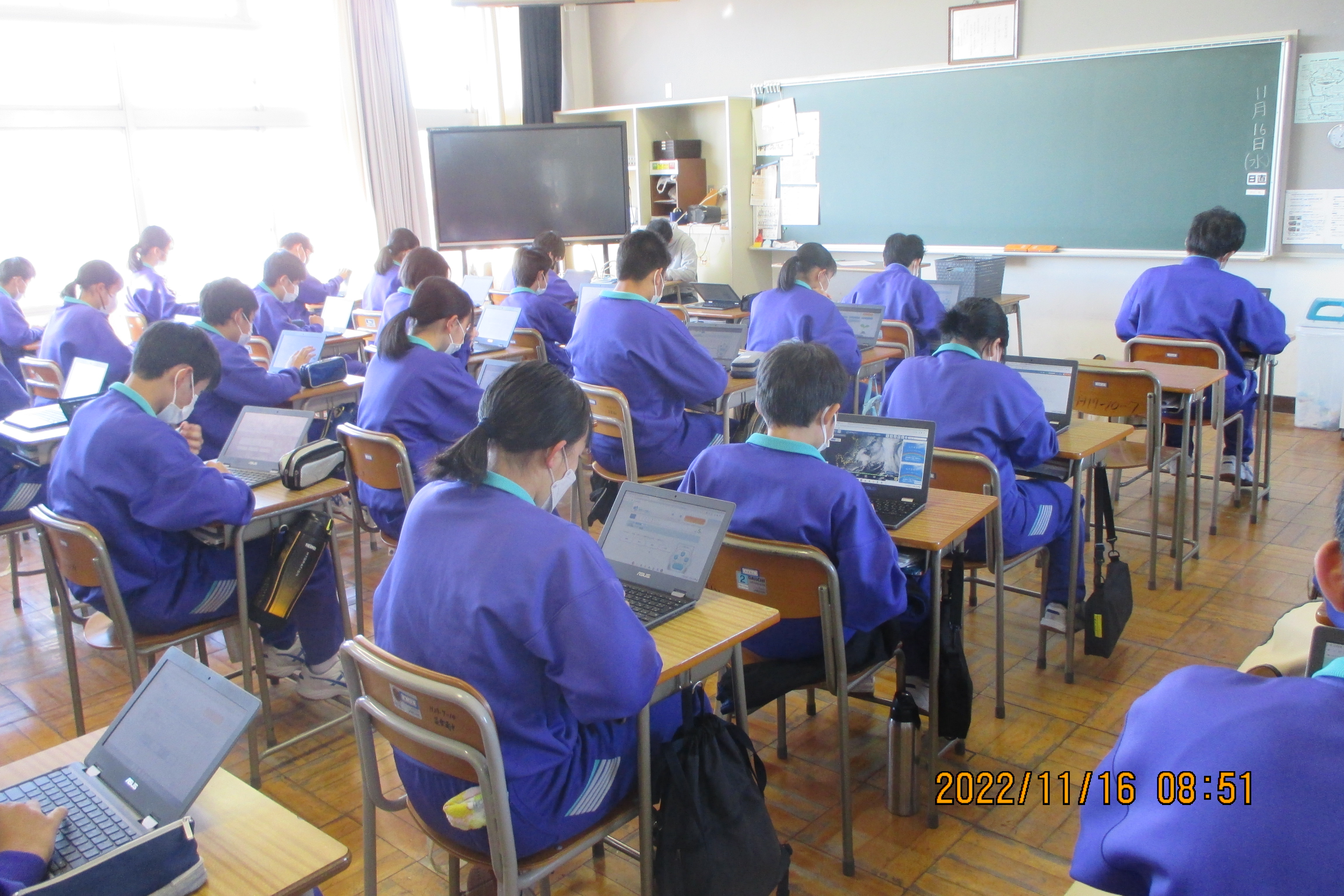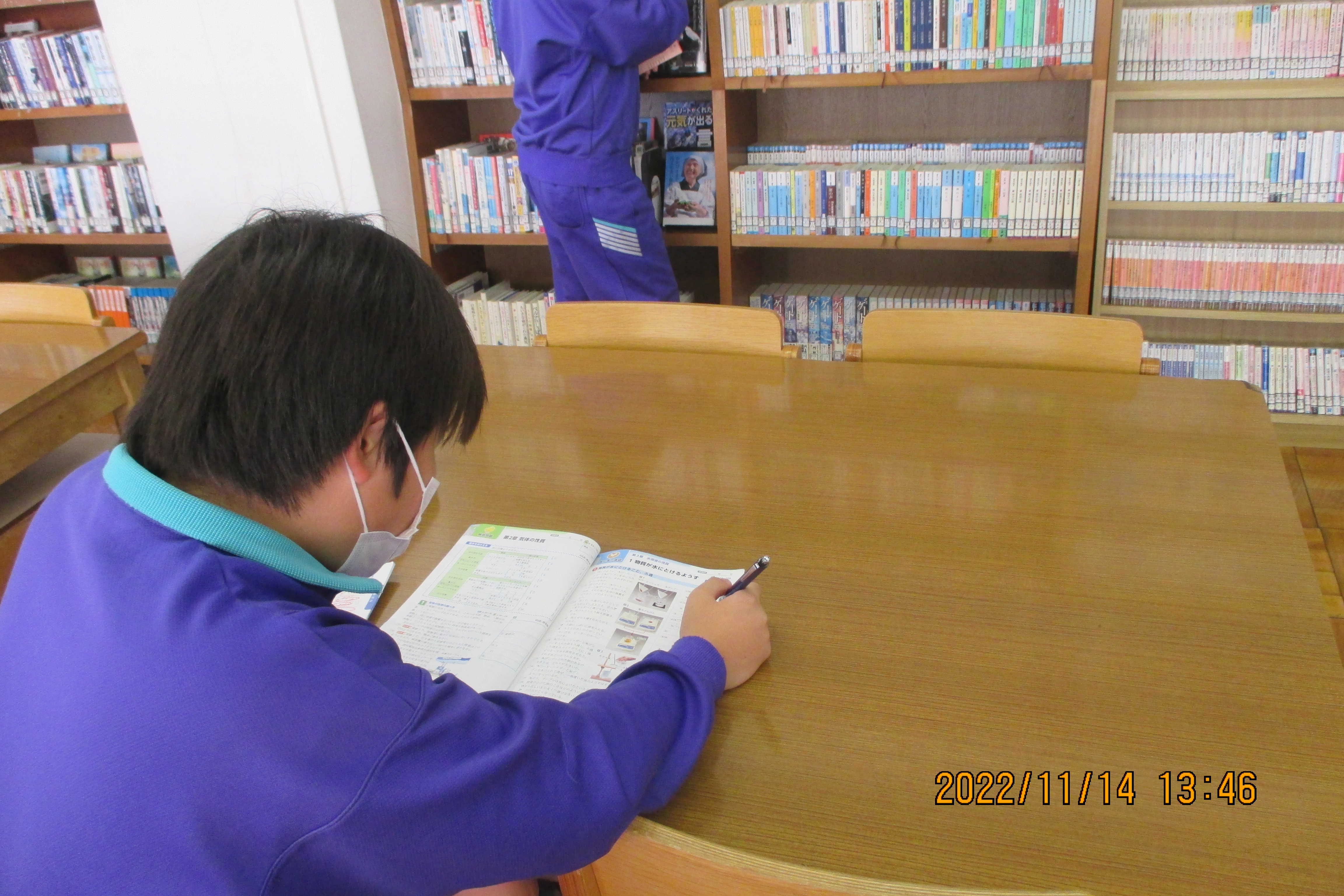 2年生の始業前の様子です。今日は、朝学習の日です。タブレットの学習機能を使い、それぞれが問題を解いています。朝の輝く日差しに包まれ、学習を進める生徒たちが美しく頼もしく感じます。