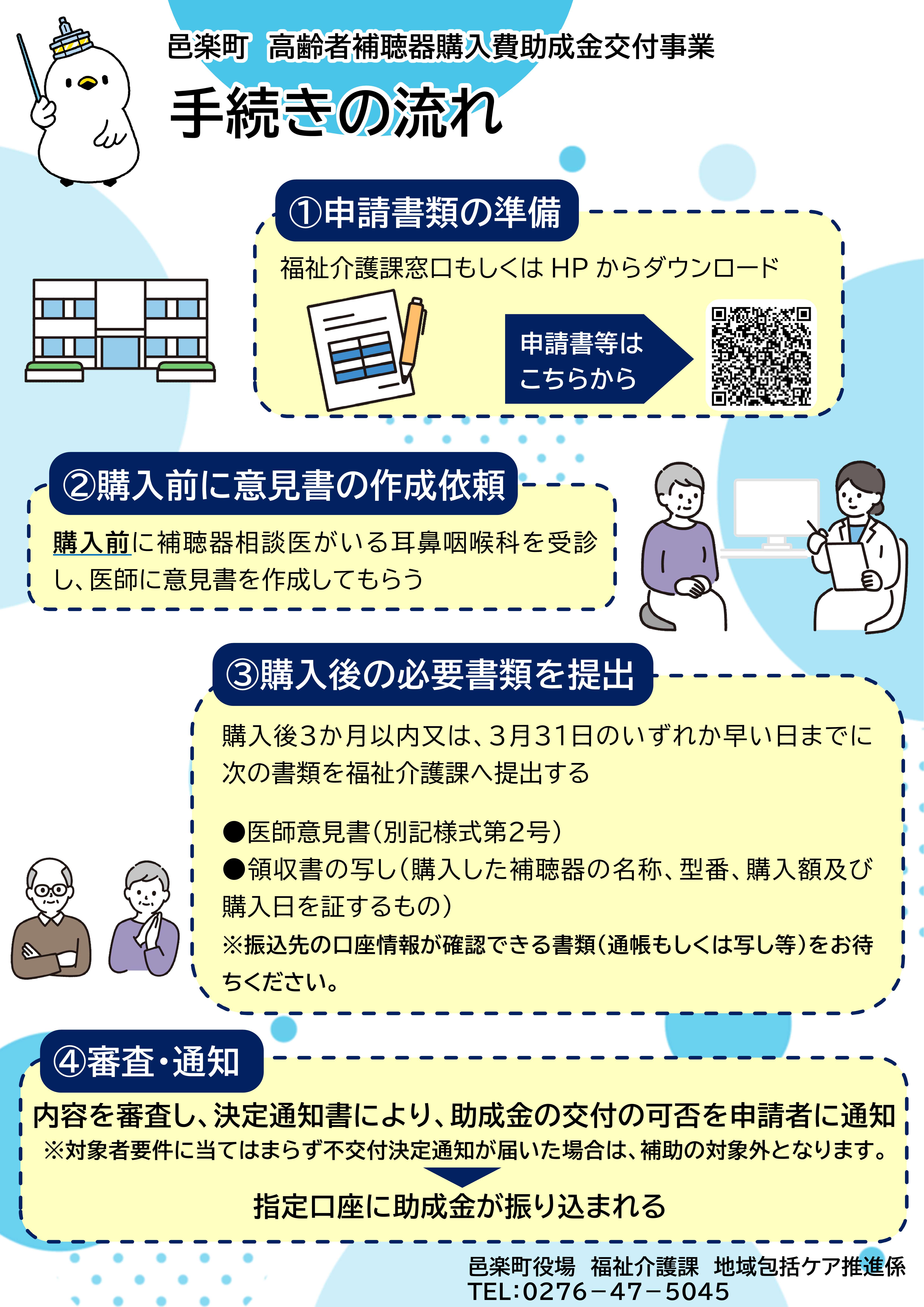 役場福祉介護課に直接申請する。邑楽町高齢者補聴器購入費助成金交付申請書・兼請求書に次に掲げる書類を添えて提出する。